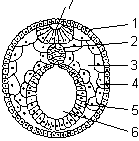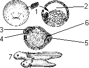 1 — эктодерма; 2 — хорда; 3 — вторичная полость тела; 4 — мезодерма; 5 — энтодерма; 6 — кишечная полость; 7 — нервная трубка.