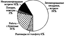Другим вариантом микроанализа управленческой деятельности является изучение рабочего времени руководителя — временной анализ. В целом он направлен на выявление особенностей «бюджета времени» руководителя, а методически реализуется как сравнительное изучение доли рабочего времени, уделяемой тому или иному компоненту управленческой деятельности в общем времени. Установлено, например, что более половины всех управленческих действий длится менее 9 минут и только одна десятая их продолжается свыше часа. Лишь 30—60% времени руководителя, как правило, посвящено контактам с членами организации, а остальное время — внешним контактам. Причем лишь одна десятая всего времени затрачивается управленцами на контакты с вышестоящими руководителями. Подавляющая часть служебного времени занята вербальными (речевыми) коммуникациями — до 80—90%. Однако при этом только 30% времени занимают контакты, инициаторами которых были сами руководители, а остальное время приходится на контакты, возникающие непреднамеренно с их стороны. Обобщенные данные по организации управленческого времени иллюстрирует диаграмма, представленная на рис. 3.