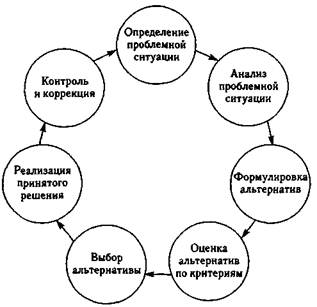Контроль исполнения, оценка эффективности и коррещия решения. Любое решение и в особенности управленческое предполагает необходимость обратной связи о его результатах. Лишь в этом случае управление как процесс может быть эффективным и действенным. Лишь в этом случае появляется возможность извлечения и накопления управленческого опыта реализации решений. Как правило, любой опыт учит, но в особенности опыт неудачных решений. Наконец, лишь при условии контроля за решениями и получения информации об их результатах возможна коррекция принятых и (или) принятие новых решений (если прежние оказались неверными). Оценка и коррекция осуществляются путем сличения полученных результатов с теми, которые были сформулированы в качестве ожидаемых на первом этапе — этапе оценки исходной проблемой ситуации. В результате этого общая структура нормативного процесса управленческого решения приобретает вид замкнутого контура, обозначаемого понятием «решенческое кольцо» (рис. 16).