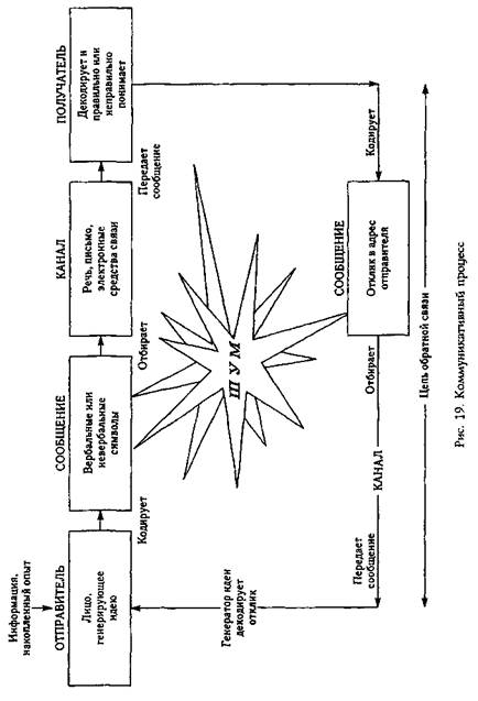 Основные компоненты и этапы процесса коммуникации имеют стабильную — инвариантную последовательность. Благодаря обратной связи и коррекции она приобретает замкнутый — кольцеобразный характер. Общая организация коммуникативного процесса схематически представлена на рис. 19 [по 58].