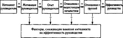 интеллекта, влияют — и зачастую более сильно — многие иные причины. Сам же интеллект также оказывает влияние на деятельность через множество промежуточных переменных. К их числу авторы относят уровень мотивации руководителя, его индивидуальный опыт, отношения с вышестоящим начальством, отношения с управляемой группой (рис. 22).