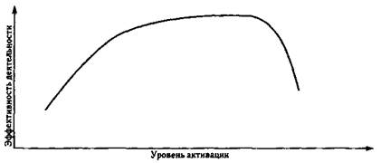 В связи с динамической характеристикой состояний существует две фундаментальные закономерности их влияния на эффективность поведения в целом, на успешность профессиональной деятельности в частности. Во-первых, наиболее общая зависимость эффективности деятельности от уровня активации: эффективность снижается как на низком, так и на чрезмерно высоком уровне активации (т.е. интенсивности психических состояний). Эта зависимость была впервые обнаружена американскими учеными Р. Иерксом и Д. Додсоном и носит их имя — «закон Йеркса—Додсона», или закон «оптимума активации». Схематично эта зависимость представлена на рис. 26.