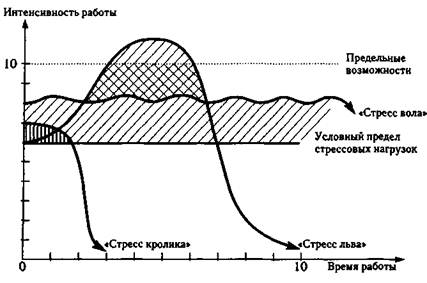 В зависимости от степени стрессустойчивости, а также от способности выдерживать стресс в течение длительного времени выделяют три основных типа личностей. Они различаются по тому, как долго личность может сохранять устойчивость (резистентность) к временному давлению хронических стрессовых условий, характеризуют ее индивидуальный порог стрессустойчивости. Одни руководители могут выдерживать стрессовые нагрузки длительное время, адаптируясь к стрессу. Другие даже при относительно краткосрочных стрессовых воздействиях уже дают сбои. Третьи — вообще только и могут эффективно работать в условиях стресса. Соответственно эти три типа обозначаются как «стресс вола», «стресс кролика» и «стресс льва» (рис. 27) [по 39].