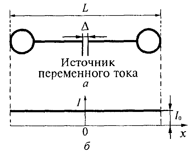Простейшим излучателем электромагнитных колебаний может служить короткий отрезок электрического проводника, физическая длина которого L много меньше длины излучаемой волны X. На практике такой излучатель электромагнитных колебаний был реализован с помощью диполя Герца, представляющего собой два небольших металлических шара, соединенных отрезком проводника, в разрез которого включен источник переменного тока (рис. 2.2, а). Благодаря наличию шаров на концах отрезка проводника длина диполя L может быть существенно уменьшена, поскольку диполь — это электромагнитный резонатор (контур), а металлические шары эквивалентны емкости контура, которая, снижая значение индуктивности, уменьшает длину диполя. В этом случае модуль линейной плотности электрического тока / будет распределен по длине излучателя равномерно, т. е. 1Х = /0 (рис. 2.2, б). Ширина разреза проводника А должна быть намного меньше длины диполя L.