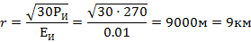 Пример 1.2. Рассчитать, на каком расстоянии от точечного излучателя электромагнитного поля мощностью 270 Вт будет создано электрическое поле напряженностью 0,01 В/м.