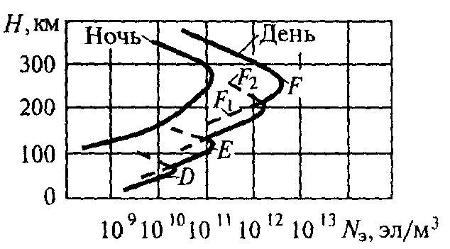 Ионосферный слой D расположен на высотах 60...90 км над поверхностью Земли. Слой представляет собой нерегулярное образование ионосферы и практически существует только в дневные часы, когда велика интенсивность солнечного ионизирующего излучения. На высотах 100... 120 км от поверхности Земли находится ионосферный слой Е (слой Кеннелли-Хевисайда). В зависимости от времени года и суток изменяется лишь концентрация свободных электронов в этом слое. Днем слой Е располагается несколько ниже, а ночью — значительно выше, что связано с изменениями уровня солнечного потока. Слои F1 и F2 ионосферы занимают области на высотах от 120 до 450 км от поверхности Земли. Обычно их рассматривают как один слой F, имеющий наибольшую концентрацию свободных электронов в ионосфере.