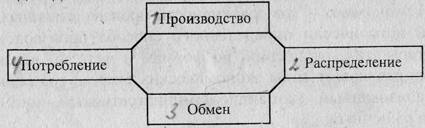 В процессе хозяйственной деятельности выделяют следующие взаимосвязанные стадии: производство, распределение, обмен и потребление.