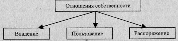 Отношения присвоения по поводу собственности закреплены в нормах права и составляют юридическую категорию собственности. Право собственности на имущество закрепляется с помощью «пучка прав». В современной юриспруденции «пучок прав» состоит из 11 элементов. Основу полномочий собственности составляет триада прав: владение, пользование, распоряжение: