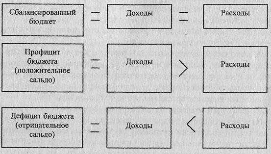 В зависимости от сложившегося соотношения между доходами и расходами госбюджета различают: