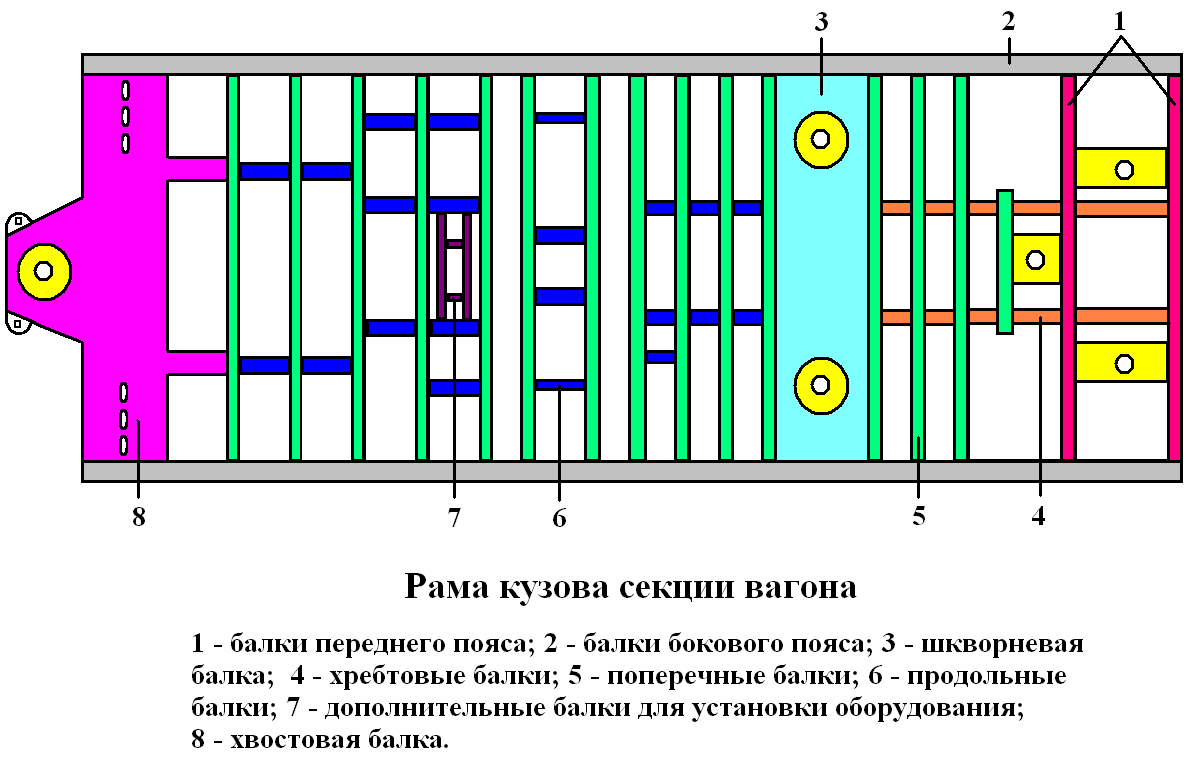 Рамы секций кузова сварной конструкции, выполнены из швеллерообразных балок, и состоят из следующих конструктивных элементов: