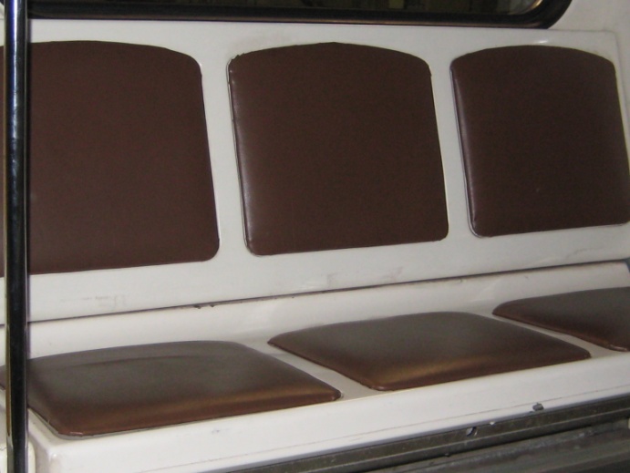 Конструкция сиденья выполнена из стеклопластиковых каркасов спинки и дивана, соединенных шарнирно между собой посредством двух кронштейнов с осями. В углублениях каркасов диванов и спинок установлены вставки с мягкой обивкой. Сиденья устанавливаются на опоры, состоящие из стоек, щековин, уголков, щитков и других силовых элементов, закрепленные на боковых стенках. На задней стенке спинки сиденья имеются крючки, которыми спинка навешивается на боковую стенку кузова. Диваны сиденья оборудованы замками и с их помощью фиксируются в закрытом положении. Установка сидений в салонах вагонов рассчитана на 54 посадочных места для пассажиров головного вагона и 60 посадочных мест для промежуточного вагона.