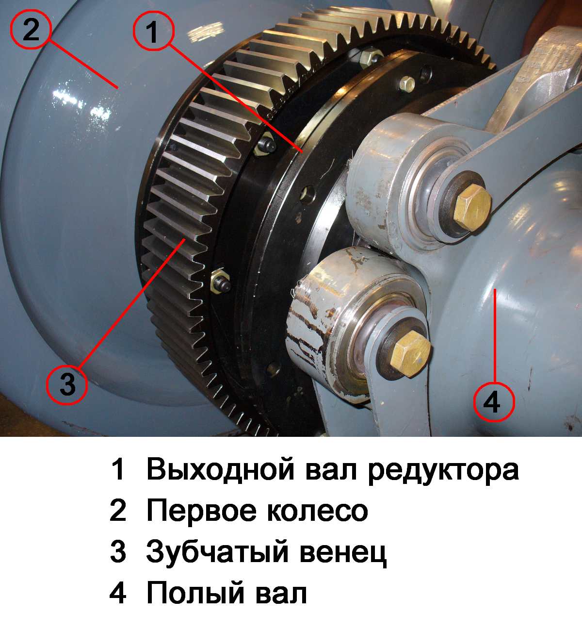 Выходной вал соединен с фланцем и через передаточный механизм посредством фланца с осью колесной пары. Фланец насаживается на ось колесной пары. Кольцо, состоящее из двух половин, свободно установлено между осью и выходным валом.
