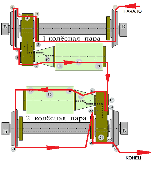Далее машинист проходит под колёсной парой и повернувшись лицом к 1-ой