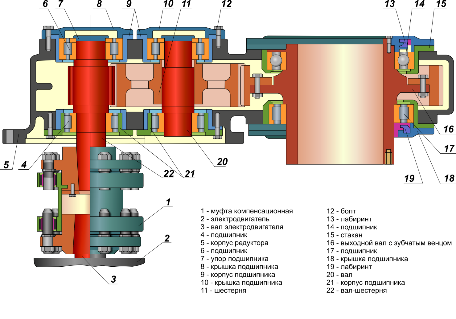 Все шестерни редуктора - прямозубые, что исключает поперечные нагрузки на подшипники и корпус редуктора. Передаточное число редуктора - 5,5. Нагрев подшипников редуктора 35°С от температуры окружающей среды.