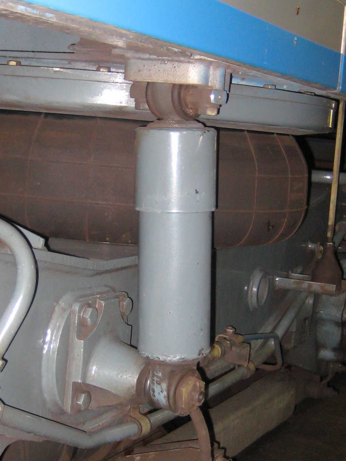 Амортизаторы устанавливаются вертикально и с помощью крепежных элементов одним концом подсоединены к раме тележки, а другим концом к раме вагона. Такая установка амортизаторов обеспечивает гашение колебаний кузова.