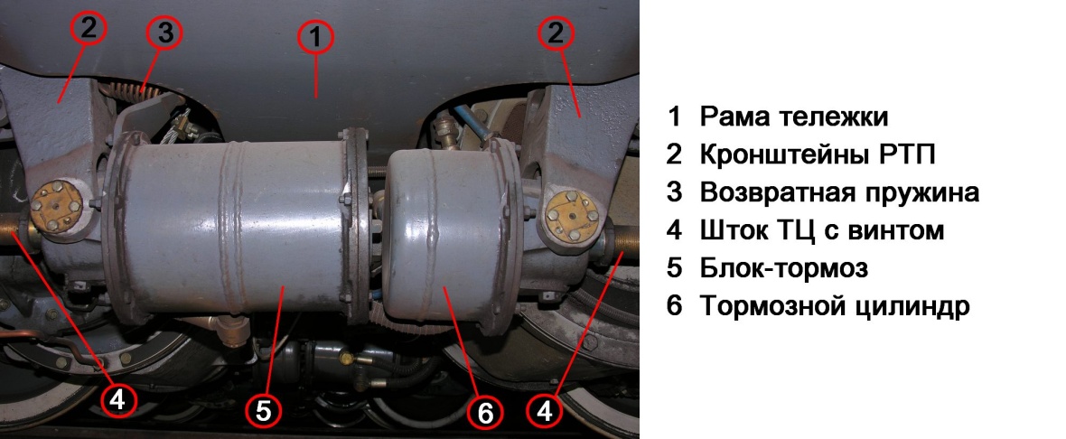 При отсутствии давления сжатого воздуха в рабочей полости стояночного тормоза пружины разжимаются и, воздействуя на шток, передают усилие на поршень тормозного цилиндра. Поршень движется, сжимая пружину, выдвигается шток, и тормозное усилие передается на тормозную колодку через рычажную передачу. Тормозная колодка воздействует на поверхность катания колеса и колесо затормаживается.При подаче сжатого воздуха в рабочую полость стояночного тормоза происходит обратное перемещение поршня. При этом пружины сжимаются и под воздействием оттормаживающего механизма и силы пружины тормозного цилиндра колесо растормаживается.