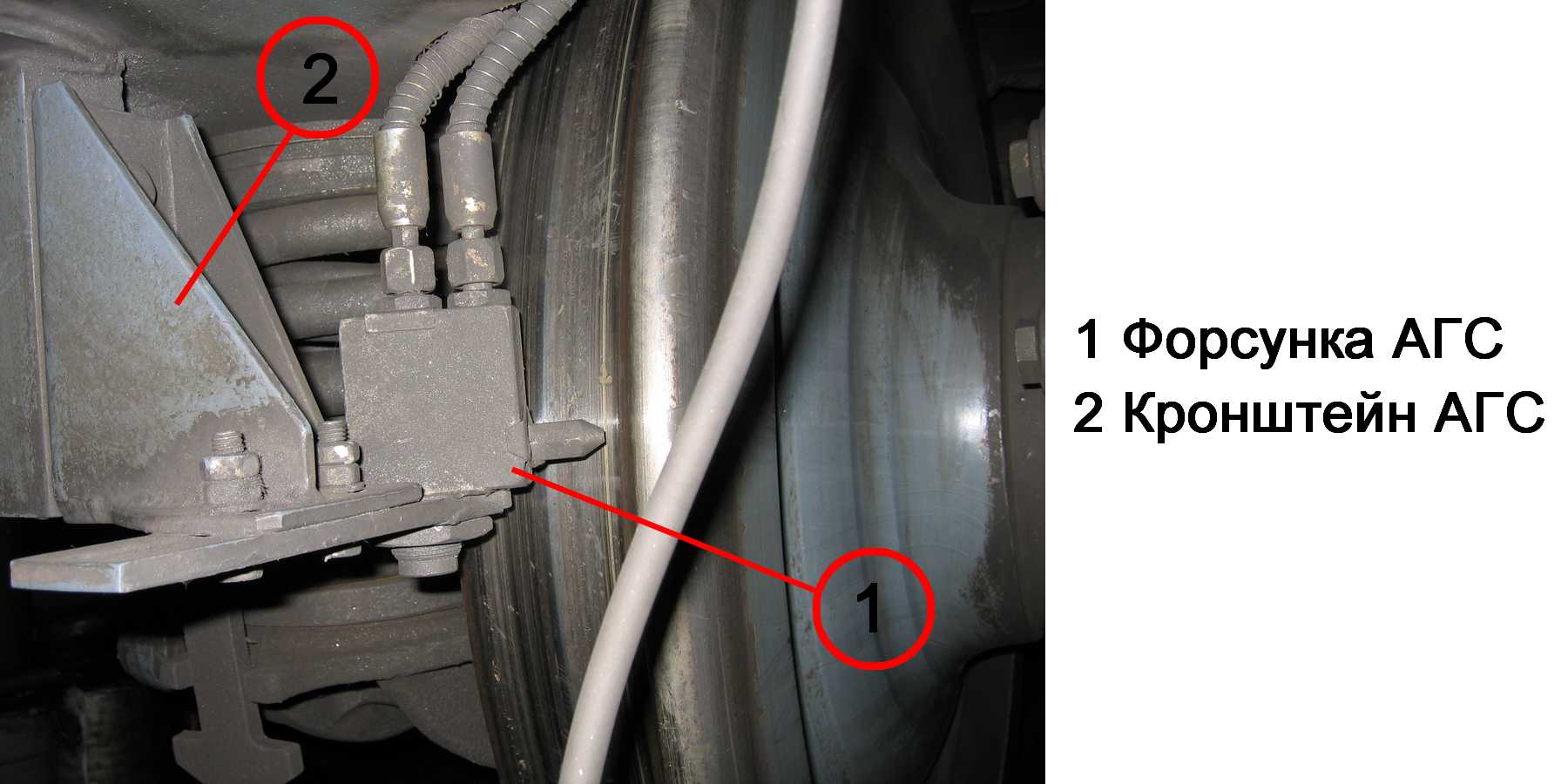 Для снижения интенсивности износа гребней колес и внутренней боковой поверхности рельсов на передней тележке вагона 81-740.4 установлено оборудование системы автоматического гребнесмазывателя АГС-8М.720 с вертикальным расположением масляного бака, в составе: