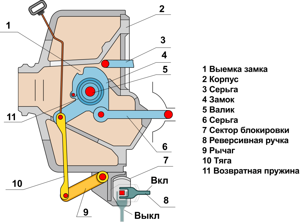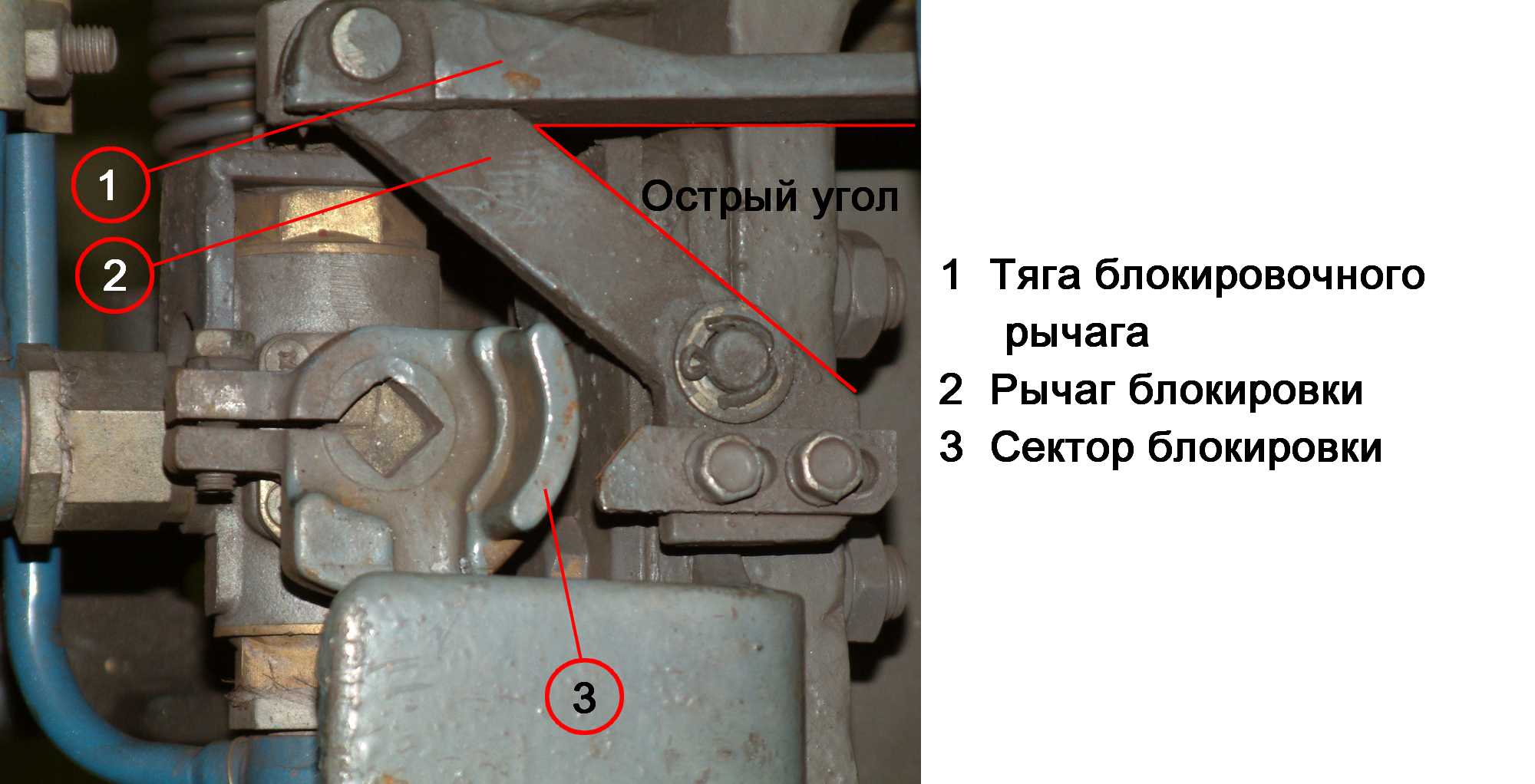 · между тягой и рычагом блокировки должен быть острый угол. Если этот угол будет свыше 90º, то это означает, что цапфы серег не вошли в зацепление с захватами встречных замков и замки не развернулись обратно в исходное положение;