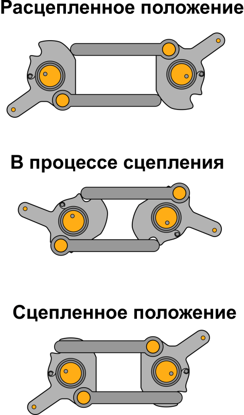 При сближении головок выступающие серьги скользят по поверхности конусных впадин встречных головок и, упираясь в боковые поверхности встречных замков, поворачивают одновременно каждая свой замок вокруг валика. Поворот происходит до тех пор, пока цапфы серег не войдут в вырезы замков встречных головок, что сопровождается характерным щелчком. После этого возвратные пружины возвратят замки в исходное положение и произойдет сцепление.