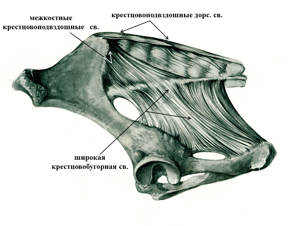 2. Крестцовоподвздошные вентральные связки – ligg. sacroiliaca ventralia – является утолщением капсулы с вентральной поверхности.