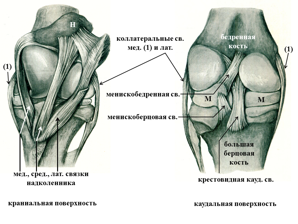 | Рисунок 16 – Коленный сустав: Н – надколенник (коленная чашка); М – мениск(по Rrachmer R. и Shroder L.) |