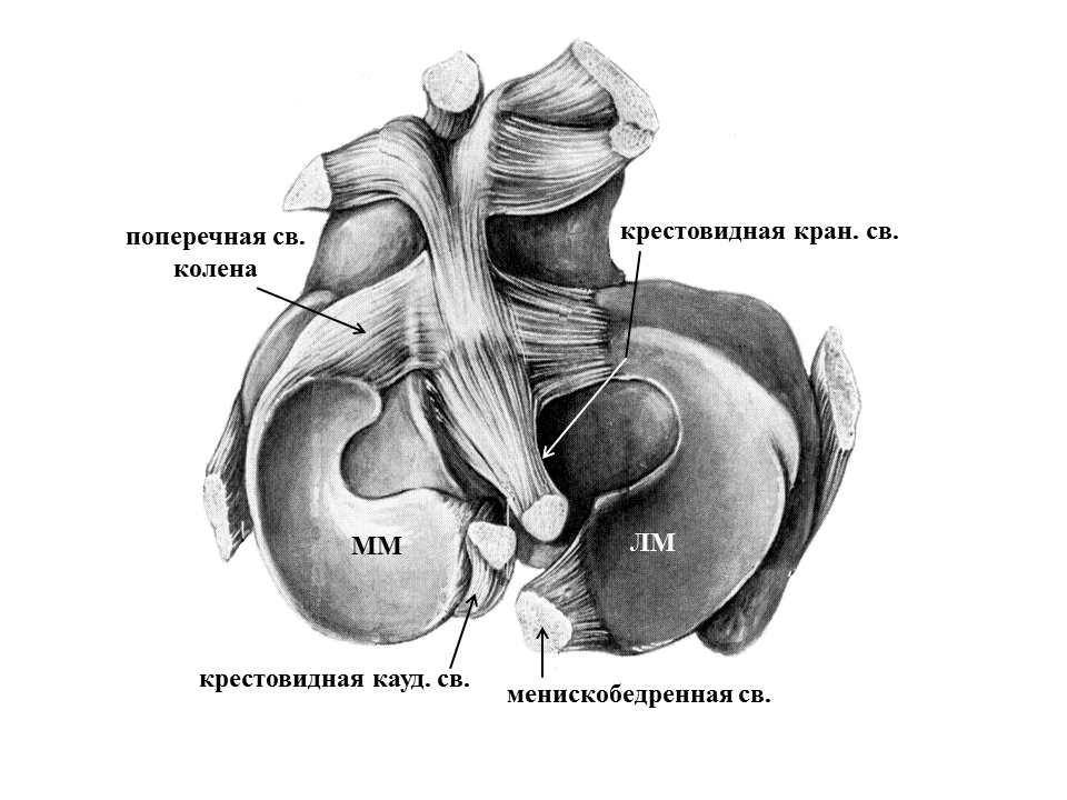 | Рисунок 17 – Связки менисков коленного сустава: ММ – медиальный мениск, ЛМ – латеральный мениск(по Rrachmer R. и Shroder L.) |