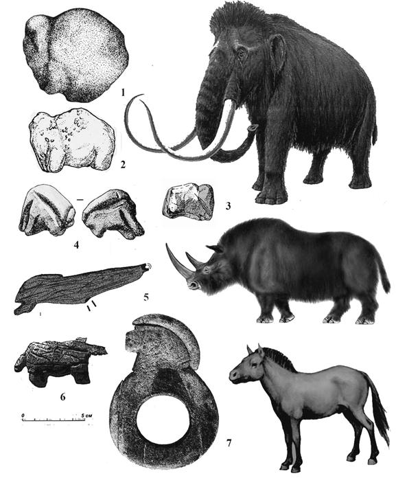 Рис.2. Скульптурные изображения животных в Деснинскои палеолите и их реальный облик. 1-4 – мамонт; 5-6 – шерстистый носорог; 7 – лошадь. 1, 2, 4, 6 – Авдеево. 3 – Елисеевичи 1. 5 – Быки 1. 7 – Быки 7. 1 – кость, 2, 4 – песчаник, 3 – известняк, 5-7 – бивень мамонта.