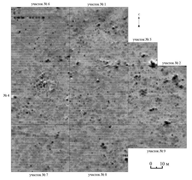 Для магнитометрического исследования применялся процессорный датчик Оверхаузера POS-2 в его градиентометрической (двухканальной) модификации (далее градиентометр POS-2). С его помощью осуществлялось измерение градиента магнитного поля земли. Принцип измерения – явление ларморовской прецессии магнитных моментов во внешнем магнитном поле. Измеряемая величина – вертикальный градиент магнитного поля Земли в каждой точке исследования, т.е. разница значений общего магнитного поля Земли над этой точкой и магнитного поля непосредственно на поверхности в точке исследования, измеренных одновременно (синхронно) по верхнему и нижнему датчикам и деленная на расстояние между датчиками над предполагаемым объектом. Расстояние между датчиками градиентометра – 2 м, высота нижнего датчика над дневной поверхностью – 0,3 м. Методика исследования – непрерывная съемка по профилю, время каждого физического наблюдения – 1/2 сек., ТТХ применяемой аппаратуры при этом методе позволяет получать значения градиента магнитного поля, с точностью +/– 0,2 нТл/2м. Участки размечались при помощи буссоли и нивелира, с ориентировкой на магнитный Север с погрешностью +/– 0,5 градуса. Размеры участков №№ 1, 2, 4–6 составляли 50 х 50 м, №3 – 20 х 25 м, №№7, 8 – 40 х 50 м, №9 – 20 х 50 м.