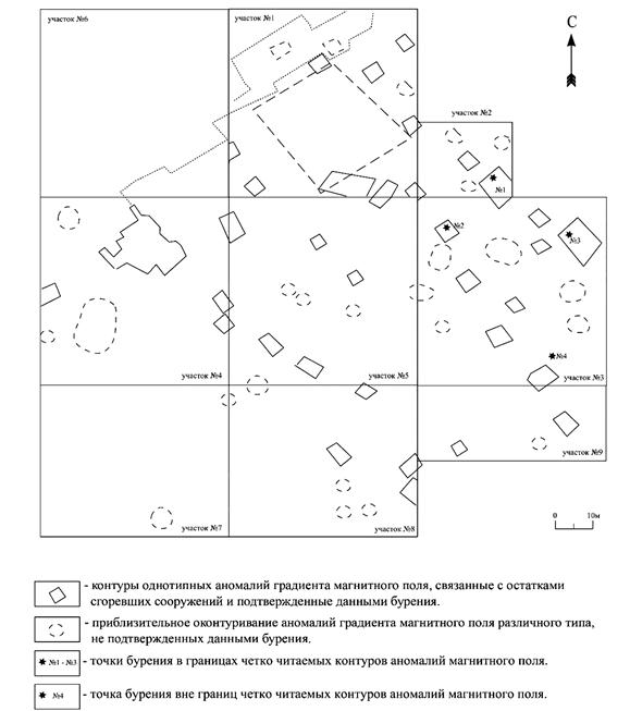 Прерывистым контуром обозначена условная граница, свободная от четких аномалий в центре участка №1. Этот условный контур по ориентировке совпадает с уже выявленными объектами, что позволяет рассматривать эту границу гипотетической площади, как составную часть планировки исследуемого поселения. В случае подтверждения данного предположения в результате раскопок достаточно перспективным представляются поиски остатков городского храма, который может быть локализован на территории площади.