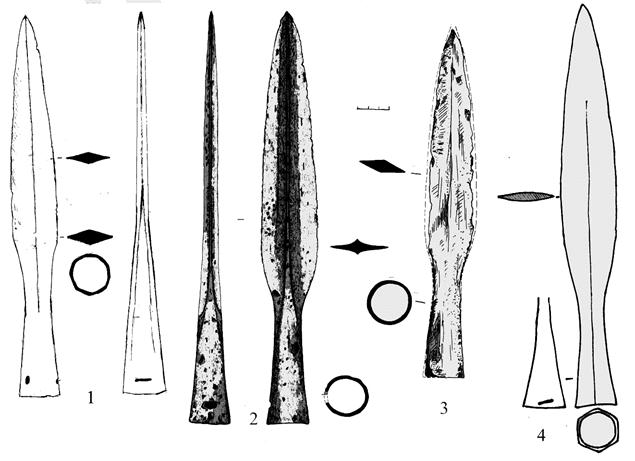 В фундаментальном труде А.Н.Кирпичникова [1966] для всей территории Северочерниговского (в основном современного Брянского) Подесенья были указаны находки всего четырех наконечников средневекового древкового колющего оружия. Два наконечника этот автор относит к типу III Б (удлиненно-треугольной формы, узколистные, почти пиковидные), два – к типу V («с пером в виде четырехгранного стержня и воронковидной тульей»), который также называется «пика» [Кирпичников, 1966, С.14, 15]. Один наконечник типа III Б (№431 по каталогу А.Н.Кирпичникова) был случайно найден в 1887 г. В Карачеве, один (№430) – во Вщиже, при раскопках Б.А.Рыбакова на детинце [Кирпичников, 1966, С 90]. Оба экземпляра типа V (№482, 483) также найдены во Вщиже при тех же обстоятельствах [Кирпичников, 1966 С.94]. Все четыре экземпляра А.Н. Кирпичников относит к XII–XIII вв., для одного (№430) несколько сужая дату до XII – первой половины XIII в. [Кирпичников, 1966. С. 90].