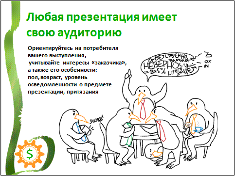 Планирование презентации стоит начать с выработки представлений об аудитории, которой ваша презентация адресована. Ориентируйтесь на интересы своих слушателей и их потребности, попытайтесь встроить учитывать их в достижении собственных целей. Такое согласование изначально определит содержательные акценты в презентации и форму изложения материала.