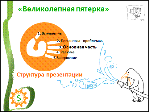 Секрет: при планировании структуры презентации старайтесь удержать все пять разделов. Однако их размер и наполненность могут меняться в зависимости от ваших целей и особенности аудитории.