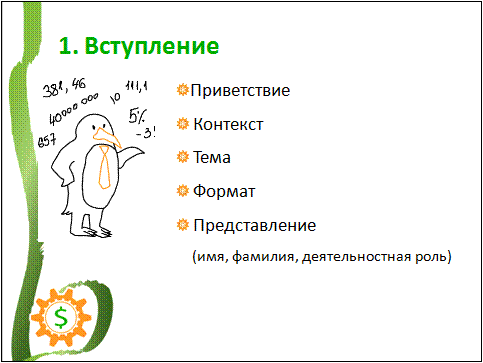 1. Сориентировать слушателей: где находится ваше выступление в море информации по заявленной теме? Также можно сообщить о внутренней структуре презентации.