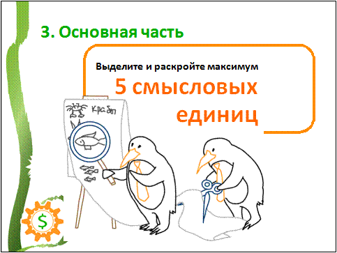 В основной части, прежде всего, выделите главные идеи, положения, которые вы хотите представить аудитории. Тезисно сформулируйте их, проверьте на соответствия вашим целям и интересам аудитории.
