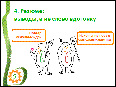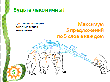 Они должны быть очень лаконичными и не содержать новых смыслов. Ваша задача напомнить аудитории свои основные идеи, а не сообщить ей новую информацию.