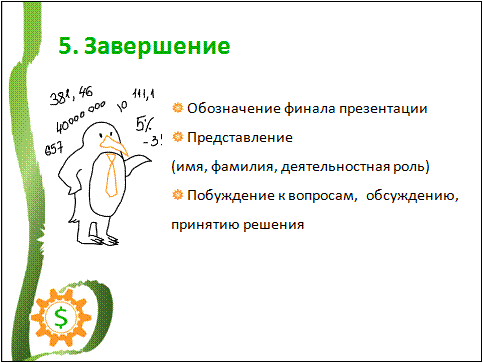 Секрет: в выводах сделайте акцент либо на выгодах, получаемых вашими слушателями, либо побуждайте их к желательным действиям.