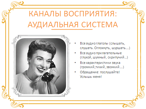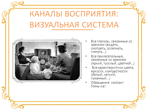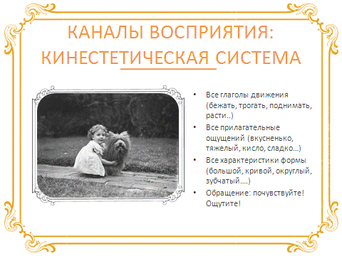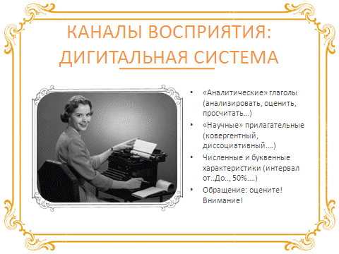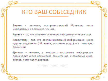 | Быстрые коды (вербальные) | «Послушай…», «Ваши доводы звучат / не звучат», «Я не услышал…» | «Посмотри…», «Нельзя не заметить», «Как Вы видите…», «Как Вам кажется» | «Я чувствую», «По моим ощущениям», «Я уверен» | «Я считаю», «Я думаю», «Я полагаю», «Я знаю», «Вы легко придете к выводам» |