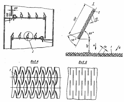 Ситчатые тарелки с просечно-вытяжными отверстиями (рисунок 2.28) используют в колонных аппаратах диаметром 1200–4000 мм. Такие тарелки состоят из отдельных секций, изготовляемых из листа толщиной 2–3 мм с просечно-вытяжными отверстиями. Тарелка работает как струйная прямоточная. Для уменьшения брызгоуноса над тарелкой устанавливают отбойные элементы 2 под углом 60°.