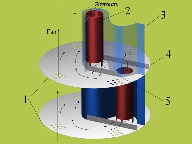Такая тарелка представляет собой перфорированный лист 1, к которому припаяна S-образная перегородка 3, делящая тарелку на две части. Стекающая с верхней тарелки жидкость через прорези в сливном стакане 2 и далее через переливную перегородку 5 поступает на тарелку и движется в направлении, указанном стрелками, контактируя с паром, поднимающимся через отверстия в листе 1. Подойдя к перегородке 3 с другой стороны, жидкость стекает на следующую тарелку через сливную перегородку 4 и сливной стакан.