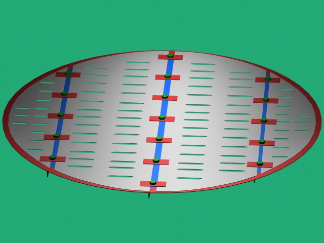 При этом часть жидкости протекает через прорези на расположенную ниже тарелку. Прорези работают периодически: места стока жидкости и прохода пара произвольно перемещаются по полотну тарелки.