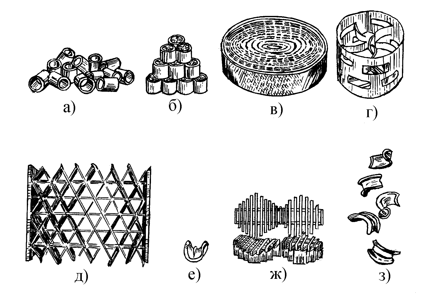 а) кольца Рашига, беспорядочно уложенные (навалом); б) кольца с перегородками, правильно уложенные; в) насадка Гудлое; г) кольца Паля; д) насадка «Спрейпак»; е) седла Берля; ж) хордовая насадка; з) седла «Инталлокс»