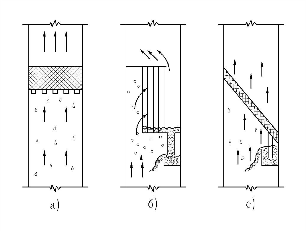 Процесс улавливания капельной влаги слоем насадки происходит за счет укрупнения мельчайших капель, оседающих на поверхности насадки при ударах и поворотах газожидкостного потока, и последующего стекания в виде крупных капель, струй, пленок.