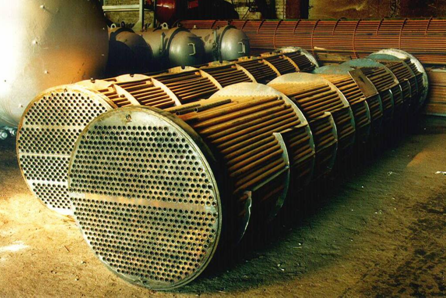 Теплообменники этой группы стандартизованы по условным давлениям Ру = 1,6 – 6,4 МПа, по диаметрам корпуса 325–1400 мм и поверхностям нагрева 10–1200 м2 с длиной труб 3–9 м. Масса их достигает 35 т. Теплообменники применяют при температурах до 450 °С.