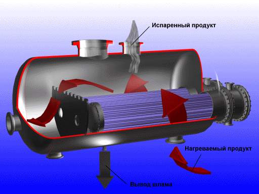 Для удобства монтажа трубного пучка в перегородке 2 и левом днище предусмотрен люк 10, через который в аппарат можно завести трос от лебедки. Продукт вводится в испаритель через штуцер 5; для защиты трубного пучка от эрозии над этим штуцером установлен отбойник 6. Пары отводятся через штуцер 9, продукт – через штуцер 1. Теплоноситель подводится в трубный пучок и отводится через штуцеры 7, 8. В таких аппаратах можно устанавливать несколько трубных пучков.