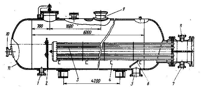 Для обеспечения свободного перемещения трубного пучка внутри кожуха в аппаратах диаметром 800 мм и более трубный пучок снабжают опорной платформой 6. Верхний штуцер 9 предназначен для ввода пара и поэтому имеет большое проходное сечение; нижний штуцер 5 предназначен для вывода конденсата и имеет меньшие размеры.