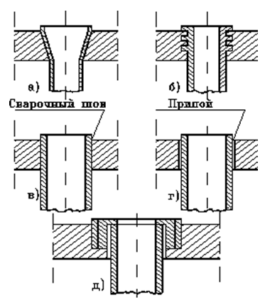 | а – развальцовкой; б – развальцовкой с канавками; в – сваркой; г – пайкой; д – сальниковыми устройствами Рисунок 2.61 – Закрепление труб в трубных решетках |