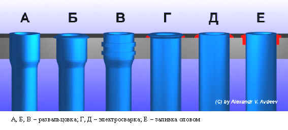 Трубы закрепляют в решетках чаще всего развальцовкой (рисунок 2.61а, б), причем особенно прочное соединение (необходимое в случае работы аппарата при повышенных давлениях) достигается при устройстве в трубных решетках отверстий с кольцевыми канавками, которые заполняются металлом трубы в процессе ее развальцовки (рисунок 2.61б). Кроме того, используют закрепление труб сваркой (рисунок 2.61в), если материал трубы не поддается вытяжке и допустимо жесткое соединение труб с трубной решеткой, а также пайкой (рису нок 2.61г), применяемой для соединения главным образом медных и латунных труб. Изредка используют соединение труб с решеткой посредством сальников (рисунок 2.61д), допускающих свободное продольное перемещение труб и возможность их быстрой замены. Такое соединение позволяет значительно уменьшить температурную деформацию труб, но является сложным, дорогим и недостаточно надежным.
