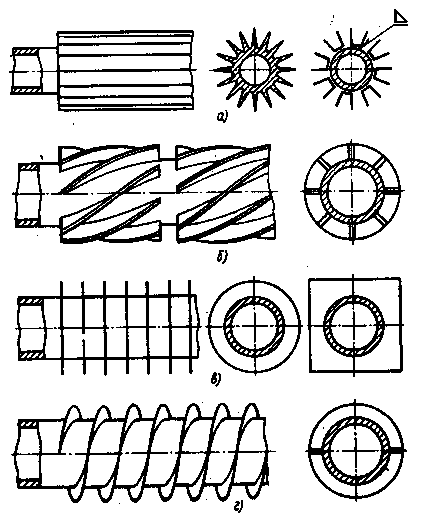 Применяют трубы с продольными (рисунок 2.62а) и разрезными (рисунок 2.62б) ребрами, с поперечными ребрами различного профиля (рисунок 2.62в). Оребрение на трубах можно выполнить в виде спиральных ребер (рисунок 2.62г), иголок различной толщины и др.