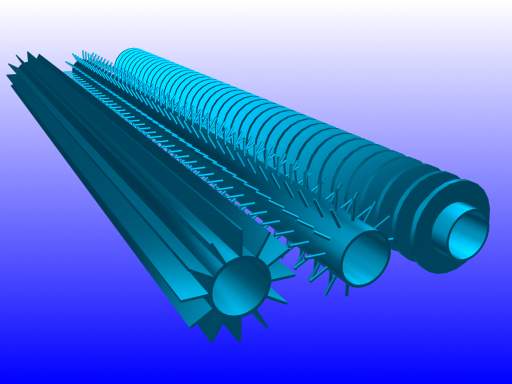 Наиболее распространенный способ крепления труб в решетке – развальцовка. Трубы вставляют в отверстия решетки с некоторым зазором, а затем обкатывают изнутри специальным инструментом, снабженным роликами (вальцовкой). Для интенсификации теплообмена иногда используют турбулизаторы – элементы, турбулизирующие или разрушающие пограничный слой теплоносителя на наружной поверхности труб. Стремление интенсифицировать теплоотдачу со стороны малоэффективного теплоносителя (газы, вязкие жидкости) привело к разработке различных конструкций оребренных труб. Установлено, что оребрение увеличивает не только теплообменную поверхность, но и коэффициент теплоотдачи от оребренной поверхности к теплоносителю вследствие турбулизации потока ребрами. При этом, однако, надо учитывать возрастание затрат на прокачивание теплоносителя.