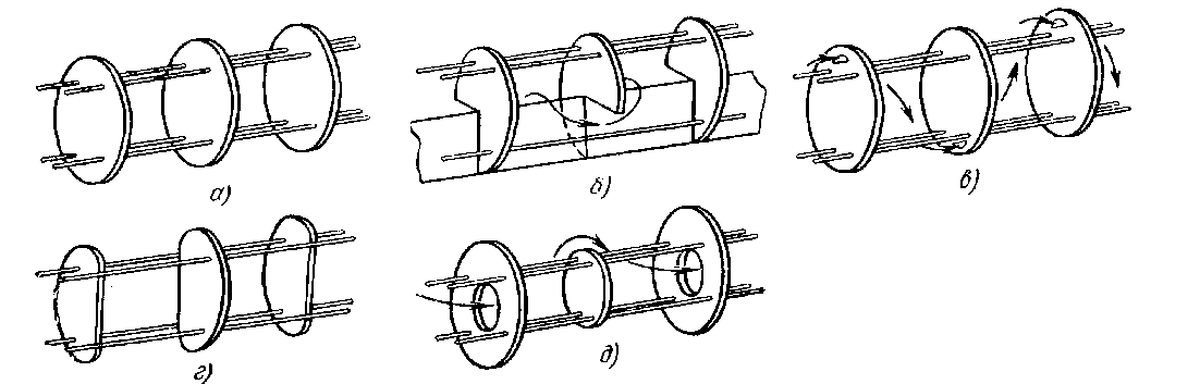 | а – сплошные; б – с секторным вырезом; в – с щелевым вырезом; г – с сегментным вырезом; д – кольцевые Рисунок 2.63 – Типы поперечных перегородок |